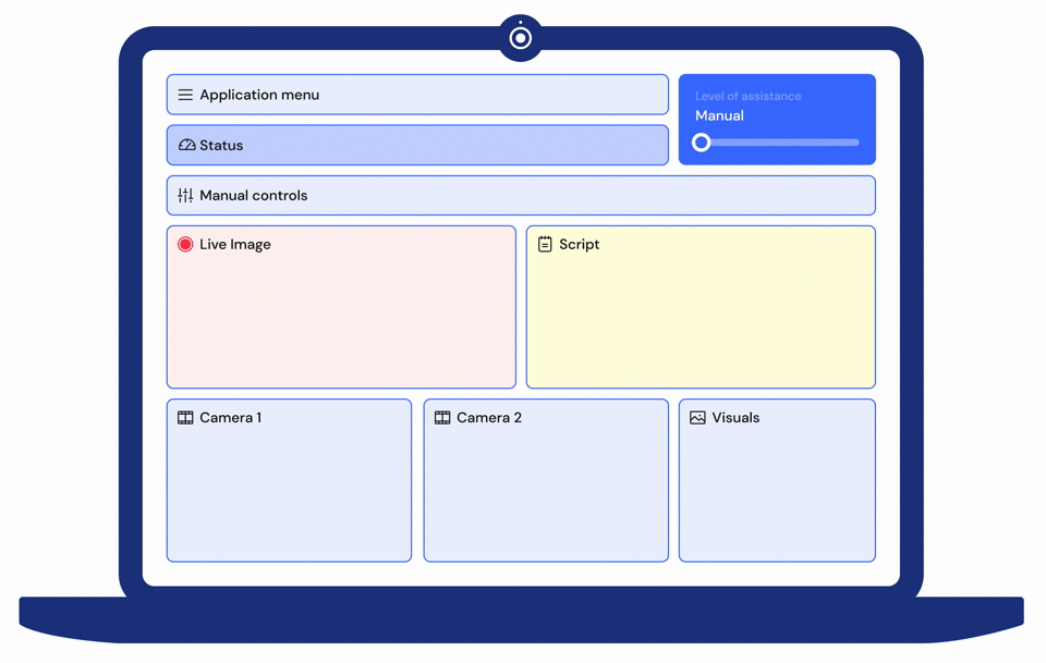 The function of the user interface should primarily be to enable the user to broadcast smoothly and to provide the necessary intuitively. However, the number of tasks is often overwhelming, making the process more difficult and negatively influencing the result. Instead, users should be able to adjust the degree of assistance step by step, and then, the elements of the graphical user interface should be reorganized accordingly. The pictures show a low-fidelity visualization of this.