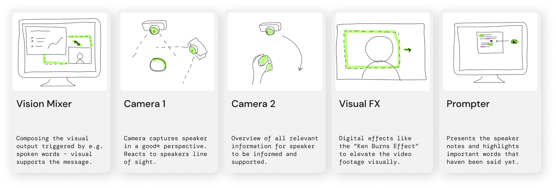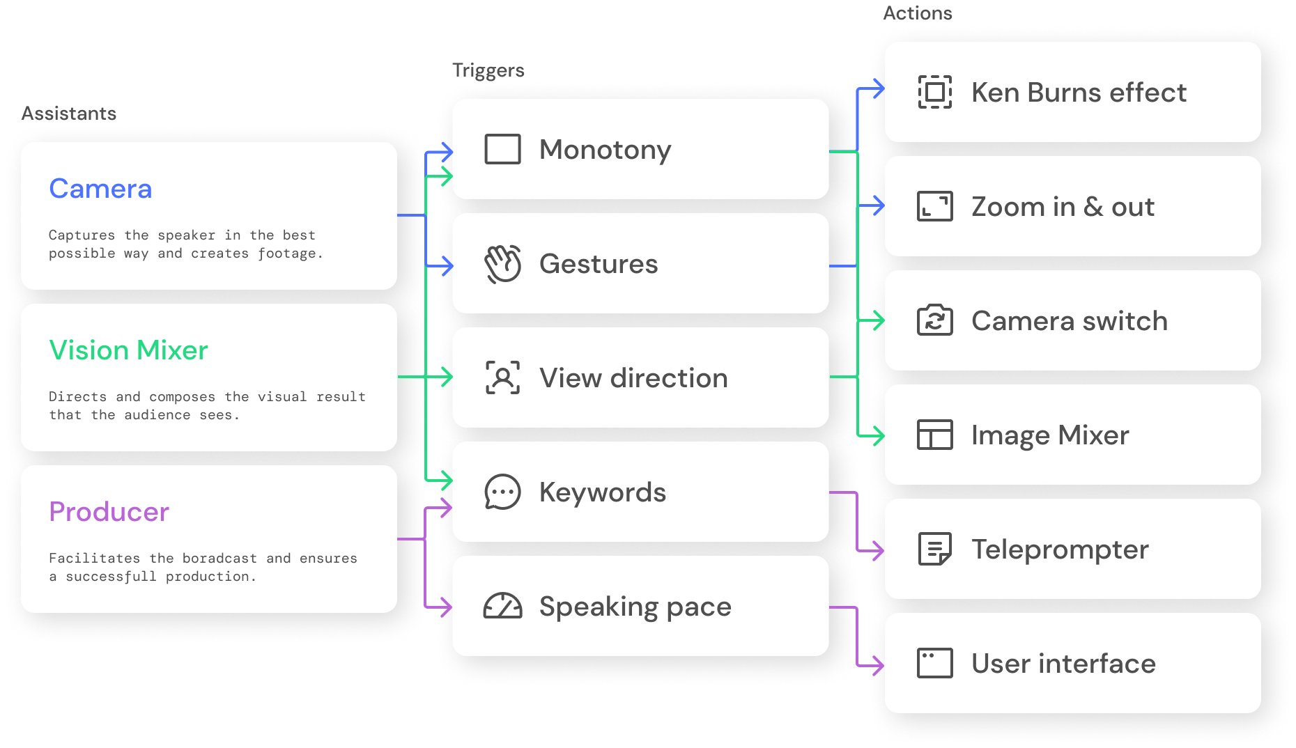 I then summarized the knowledge gained from the simulations produced in a concept. The concept shows which assistant roles react to which triggers during the broadcast and in which form. Crucial is the fact that multiple triggers can cause most actions. But conversely, the exact triggers can also lead to different actions.